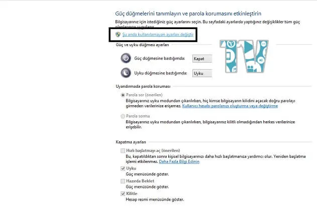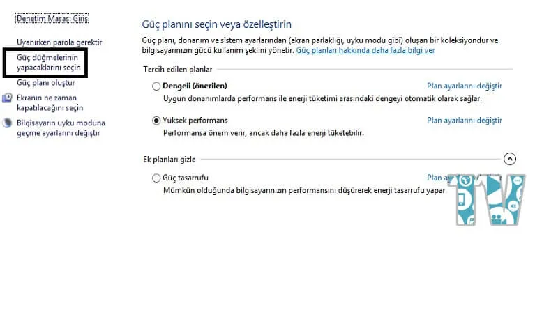 Denetim Masası'na girdikten sonra -->> Donanım ve Ses daha sonra ise -->> Güç seçenekleri sayfasına geliyoruz. Veyahut Başlat -->> Arama Kısmına -->> Güç Seçenekleri yazıp çıkan sonuca tıklıyoruz. Yukarıdaki resimde de gözüktüğü üzere "Güç Düğmelerinin Yapacaklarını Seçin" yazısına tıklıyoruz.