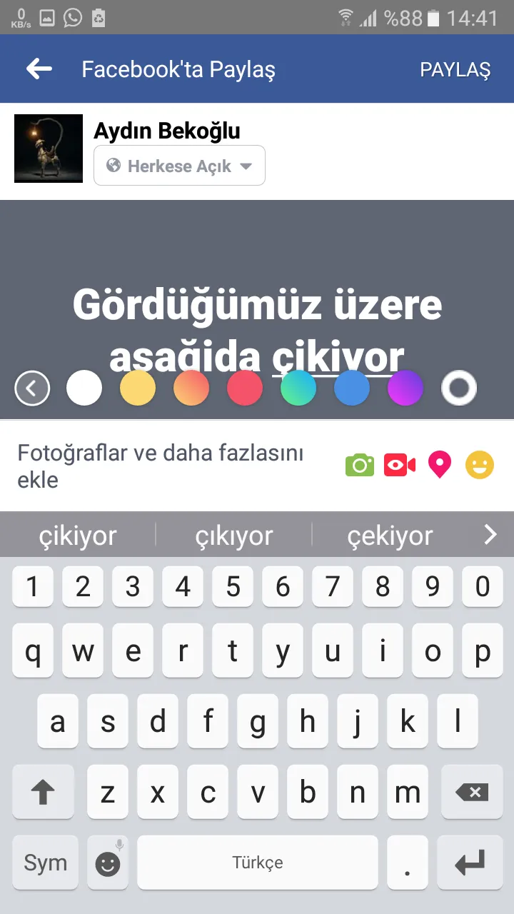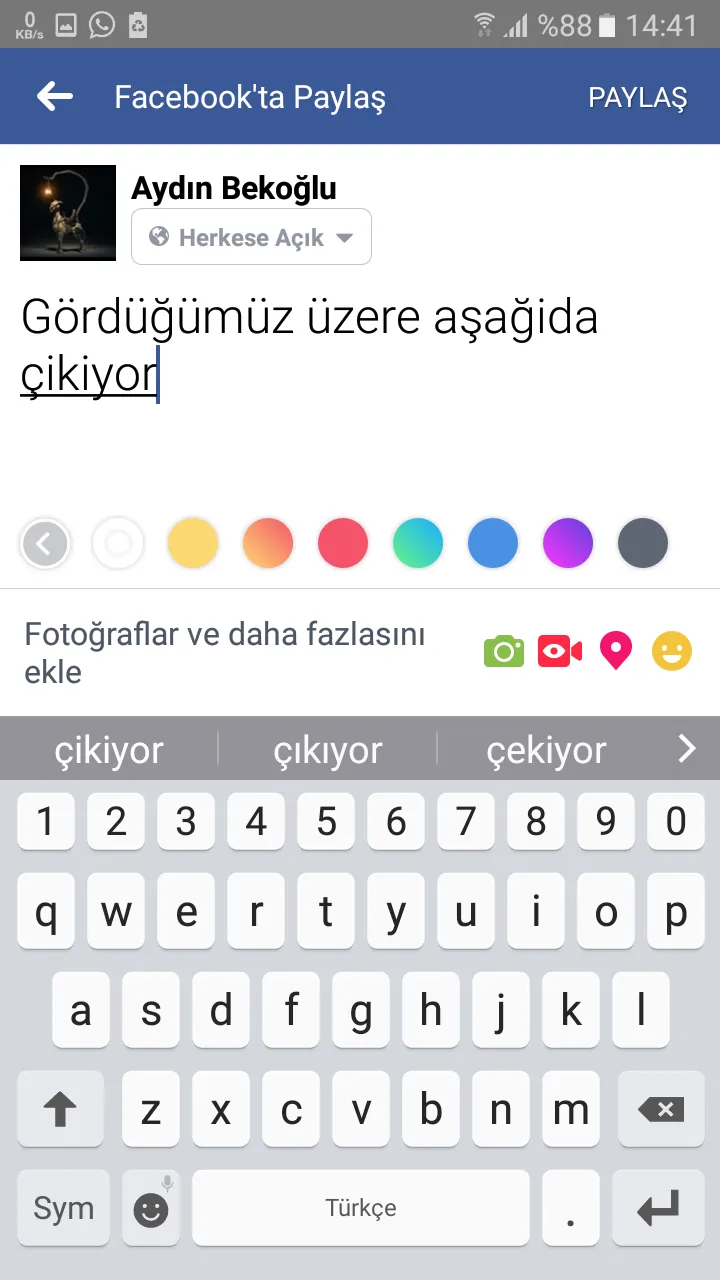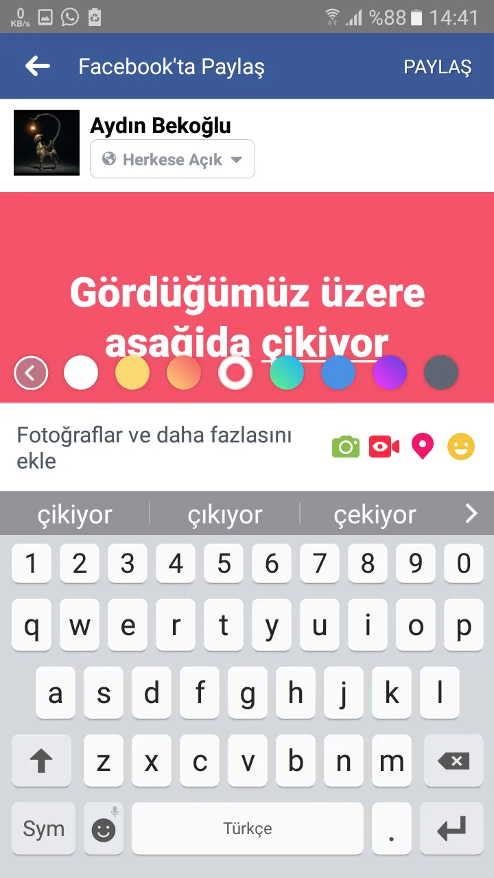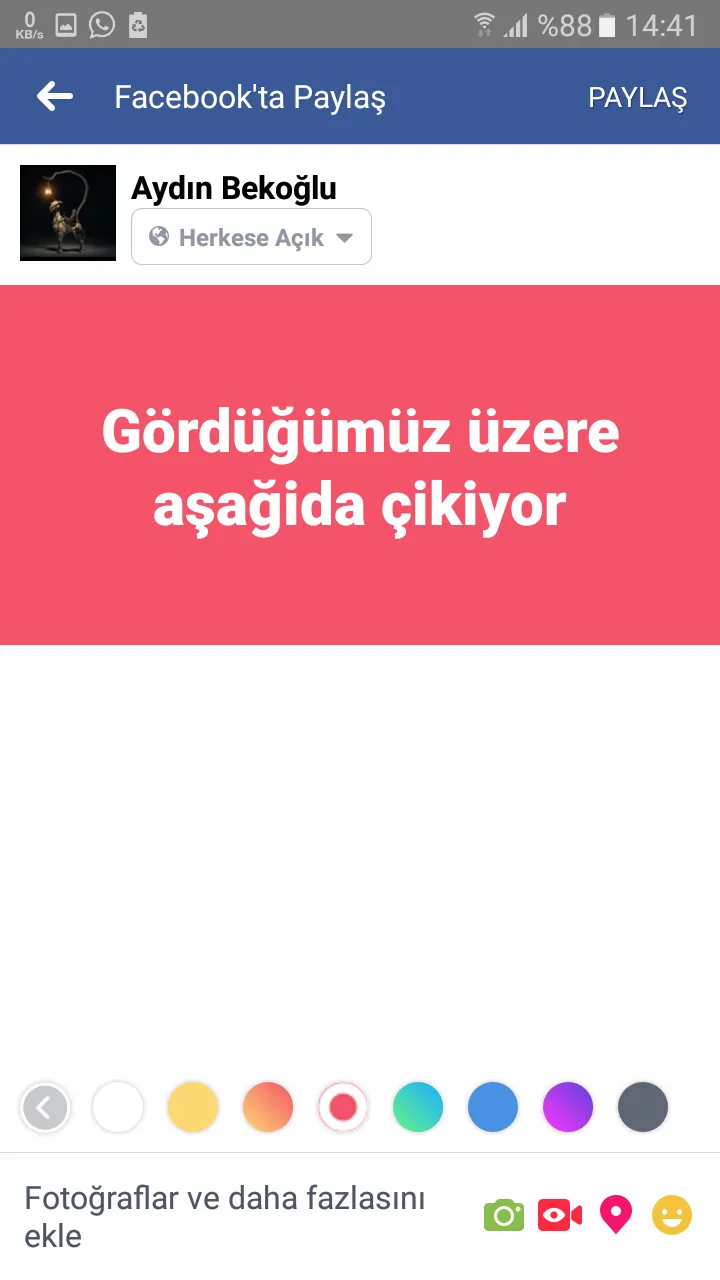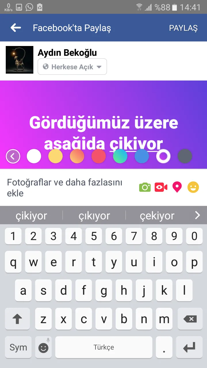 3 gün önce facebook uygulamasına yeni bir güncelleme geldi. Bu yeni güncellemede arka planı renkli durumlar paylaşabiliyoruz. Aslında bu güncelleme sessiz sedasız yapıldı. Çünkü çoğu kullanıcı bu güncellemeden habersiz. Bende dün öğrendim ve bugün bu yazıyı paylaşıyorum. Şuan için sekiz renk topundan oluşan bu yeni özelliğin nasıl kullanıldığını birazdan anlatacağım. Şuan için sadece mobil kullanıcılar bu özellikten yararlanmakta. Yakın zamanda tarayıcı üzerinden facebook' u kullanan kullanıcılara da gelmesi ümidiyle. *Facebook uygulamasını açtıktan sonra > "Ne düşünüyorsun?" bölümüne tıklıyorsunuz. > Daha sonra yazı yazma kısmına tıklıyorsunuz. > Alt tarafta renk topları hemen açılıyor. İstediğiniz rengi seçip paylaşım yapabilirsiniz.