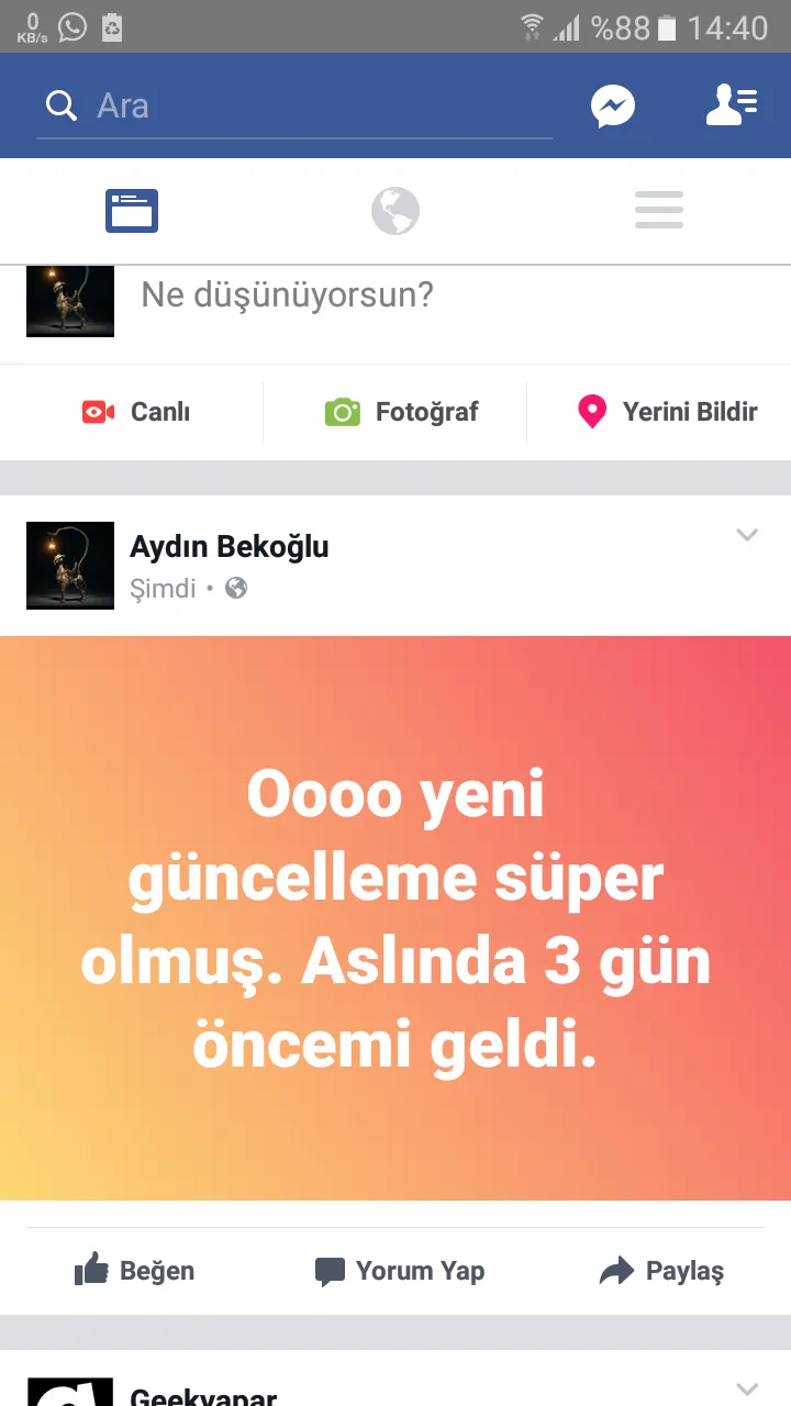 Facebook Uygulamasına Renkli Gönderi Özelliği Geldi 3 gün önce facebook uygulamasına yeni bir güncelleme geldi. Bu yeni güncellemede arka planı renkli durumlar paylaşabiliyoruz. Aslında bu güncell